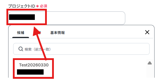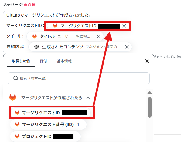 上記マージリクエストを作成した「プロジェクトID」を候補より選択します。