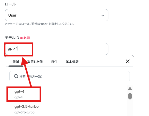「ロール」はUser、「モデルID」はお好きなモデルを候補から選択しましょう。今回はgpt-4にしました。