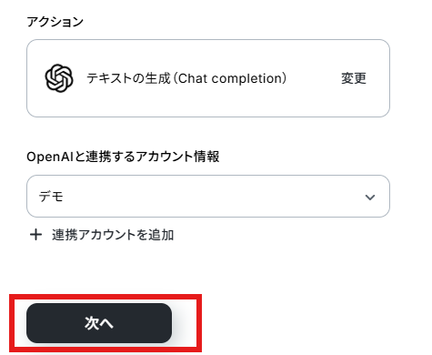 アクションはデフォルト設定のまま、アカウント情報は、連携したいアカウントが選択されているか確認してください。確認出来たら「次へ」をクリックしましょう。