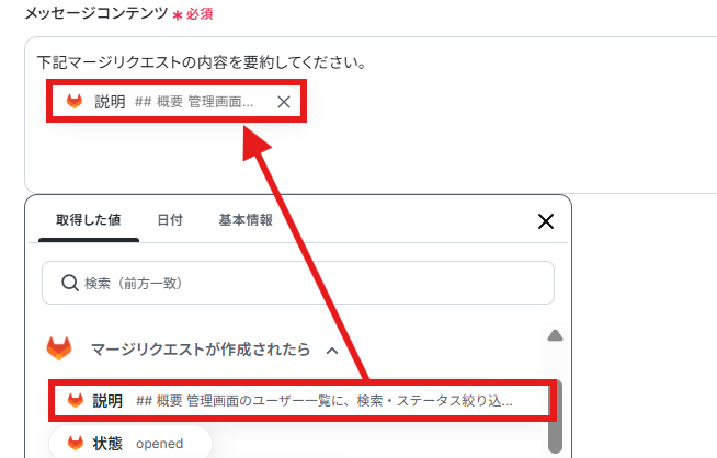 ステップ4:OpenAIでマージリクエストの内容を要約する 次に、OpenAIでマージリクエストの内容を要約します。「テキストの生成」をクリックしてください。