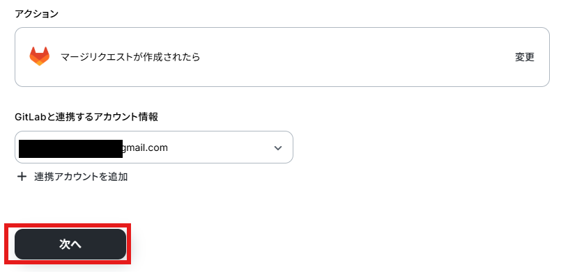アクションはデフォルト設定のまま、アカウント情報は、連携したいアカウントが選択されているか確認してください。確認が終わったら「次へ」で進みましょう。
