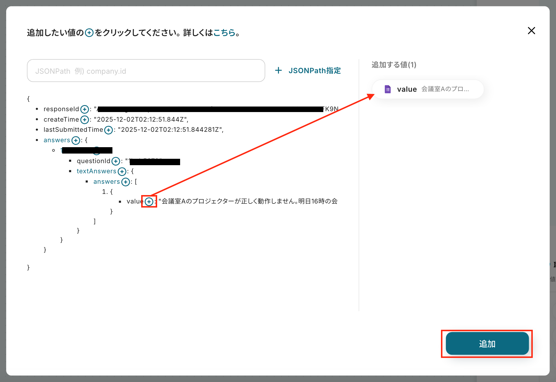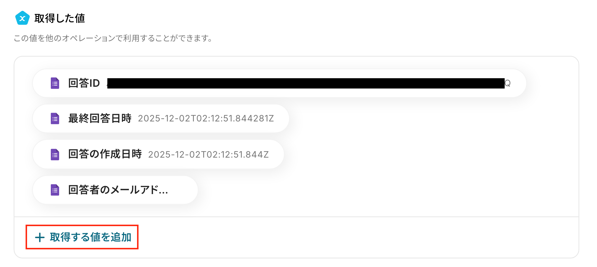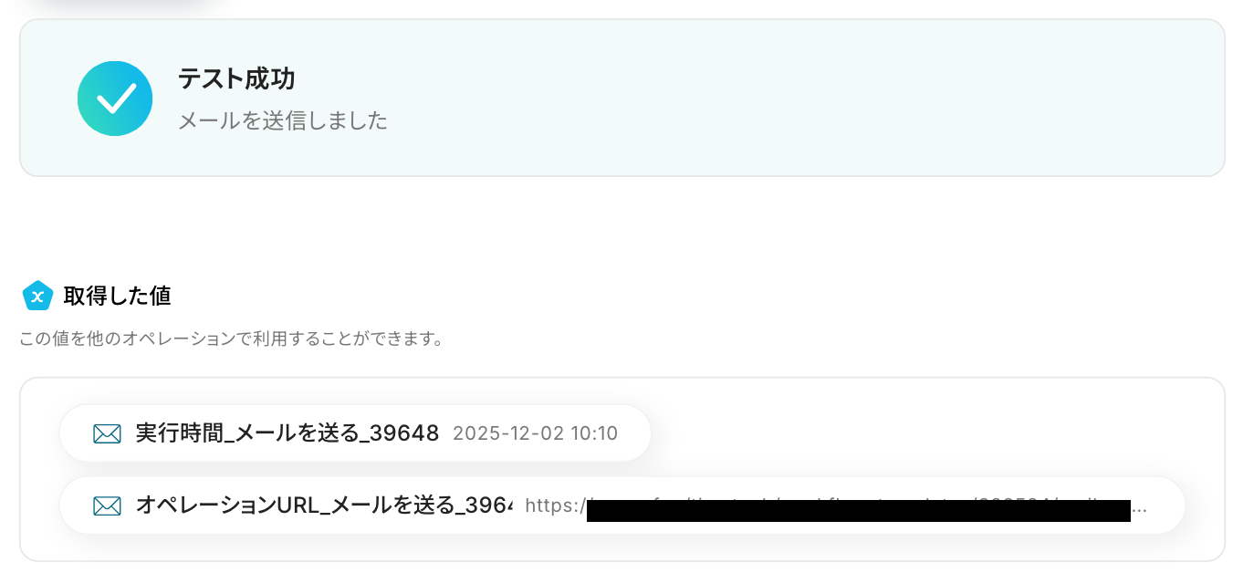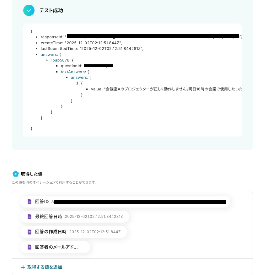 テストが成功すると、先ほど回答した内容が「取得した値」として表示されます。※ 取得した値 とは? トリガーやオペレーション設定時に、「テスト」を実行して取得した値のことを指します。 後続のオペレーション設定時の値として利用でき、フローボットを起動する度に変動した値となります。