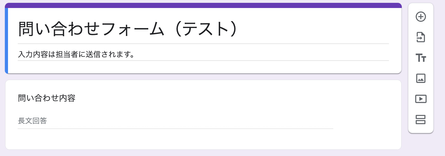 ここでGoogleフォームの画面に移り、トリガーとなるGoogleフォームの用意をします。 今回は以下のフォームを用意しました!フォームの用意ができたら、必ず回答を送信しておきましょう。値は仮のもので問題ありません!※フォームに回答されないと設定のためのテストに成功しないため、ご注意ください。