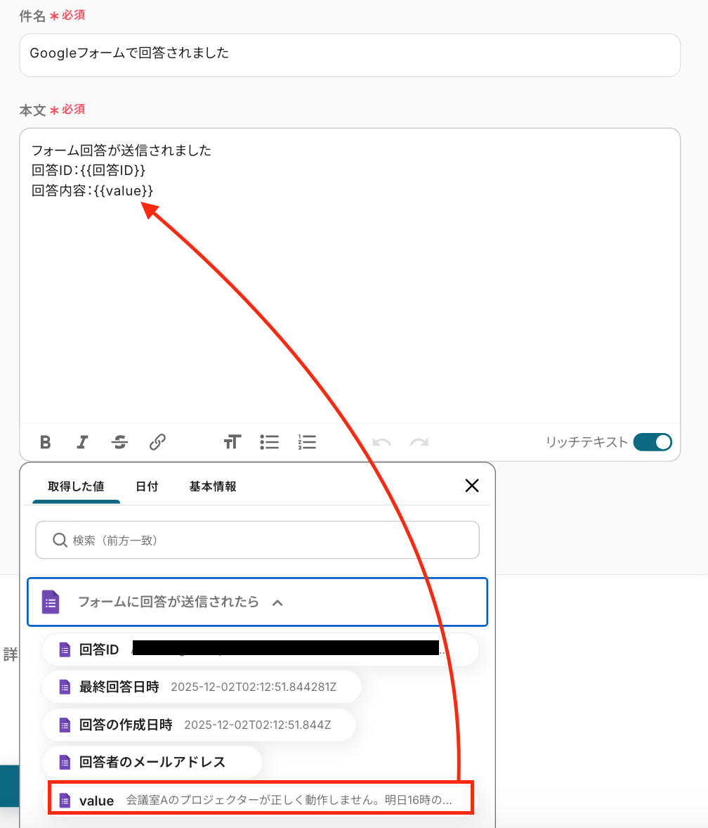 本文 :任意の文章を設定。 Googleフォームのトリガー設定で取得した値と組み合わせて自由に設定してください。