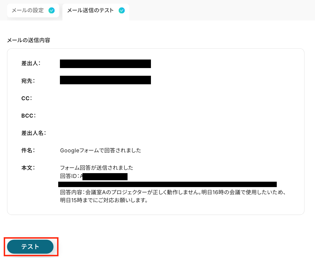 次の画面で「メールの送信内容」を確認し「テスト」をクリックします。 ※実際にメールが送信されるので、間違いがないか確認をしてくださいね。