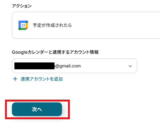 アクションはデフォルト設定のまま、アカウント情報は、連携したいアカウントが選択されているか確認してください。確認出来たら「次へ」をクリックしましょう。