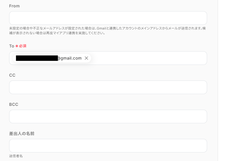 - Gmailでメールを送信するアクションでは、送信先のメールアドレスや件名、本文の内容を任意で設定、変更することができます。