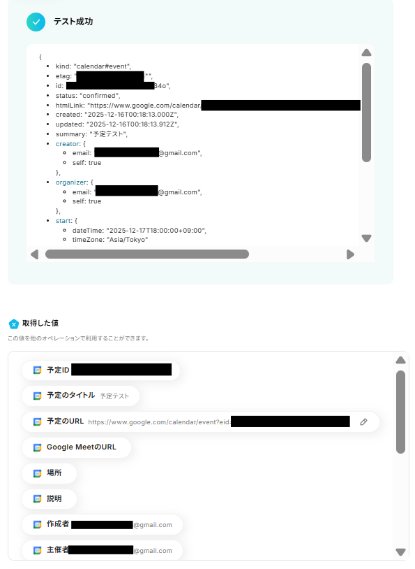 - 最後に、オペレーションでGoogleカレンダーの「予定を作成」アクションを設定し、取得した情報をもとにカレンダーへ予定を登録します。
