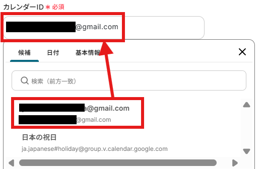 前ページで設定を確認した、連携アカウントのカレンダーIDが「候補」に表示されますので、そちらからカレンダーIDを選択します。