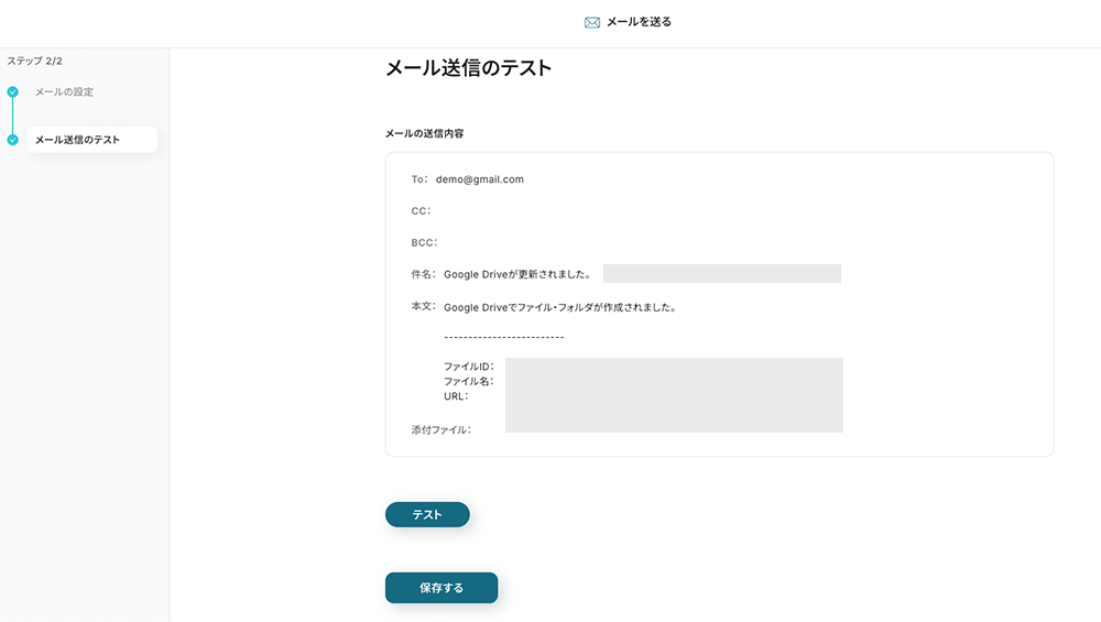 プレビューが確認ができたらテストボタンをクリックします。成功すると、指定したメールアドレスへメールが送信されます。