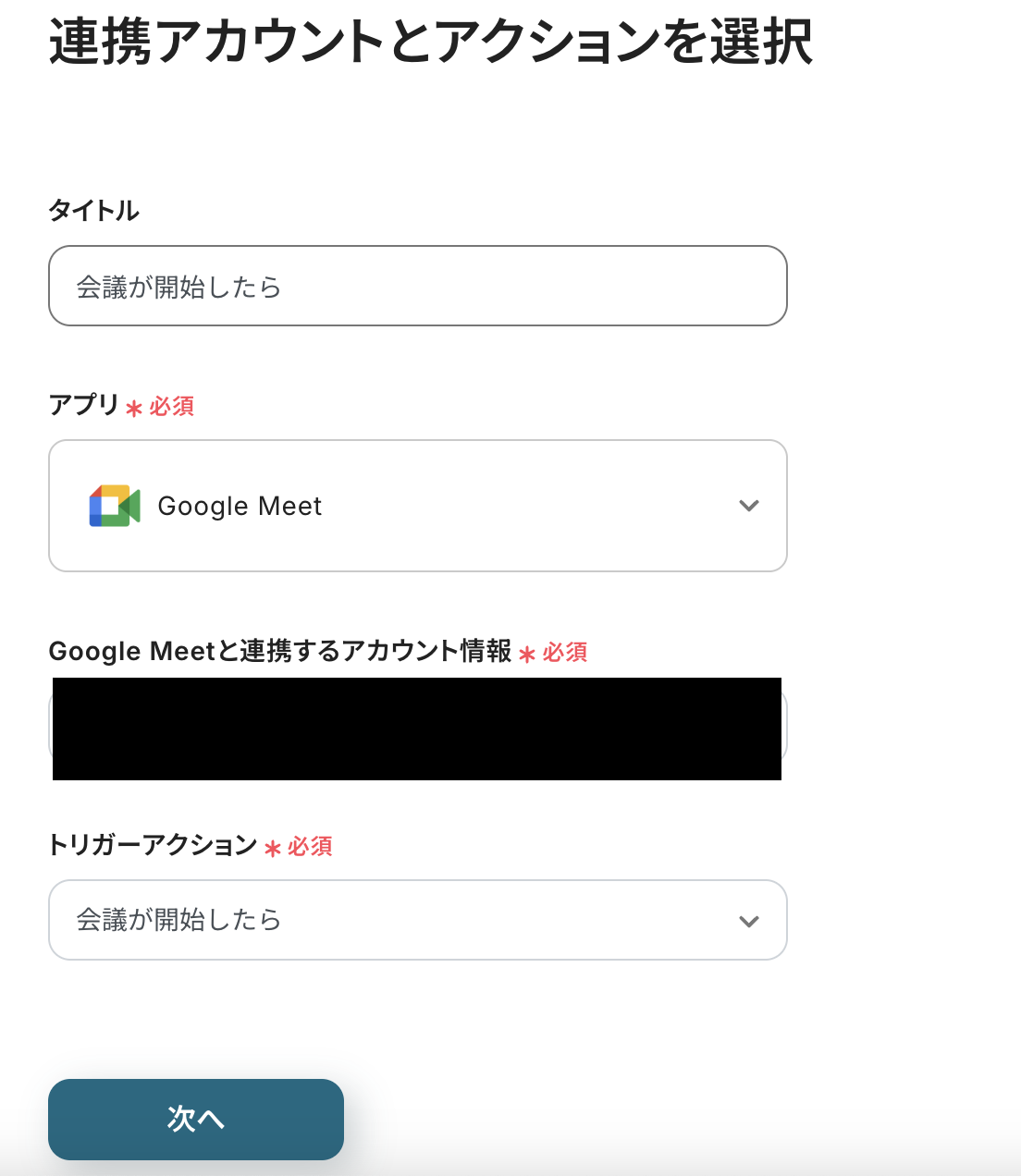 タイトルは、コピーした時に入力されていますが、変更できます! Google Meetと連携するアカウント情報を確認しておきます。 トリガーアクションは、「会議が開始したら」が選択されていることを確認し、「次へ」をクリックしてください。