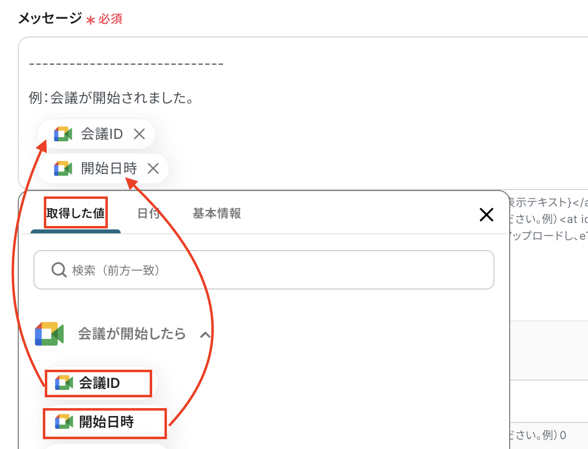 メッセージはGoogle Meetの取得した値から、通知したい項目を選択し、作成しましょう。 取得した値を使うことで、都度手動で値を設定する必要がなくなります。 取得した値を使用せずにメッセージ作成することもできますが、Google Meetの情報を通知することで、情報共有しやすくなります! 詳細についてはこちら を参考にしましょう。 設定後、テストをクリックし、チャネルにメッセージが通知できたら保存してください。