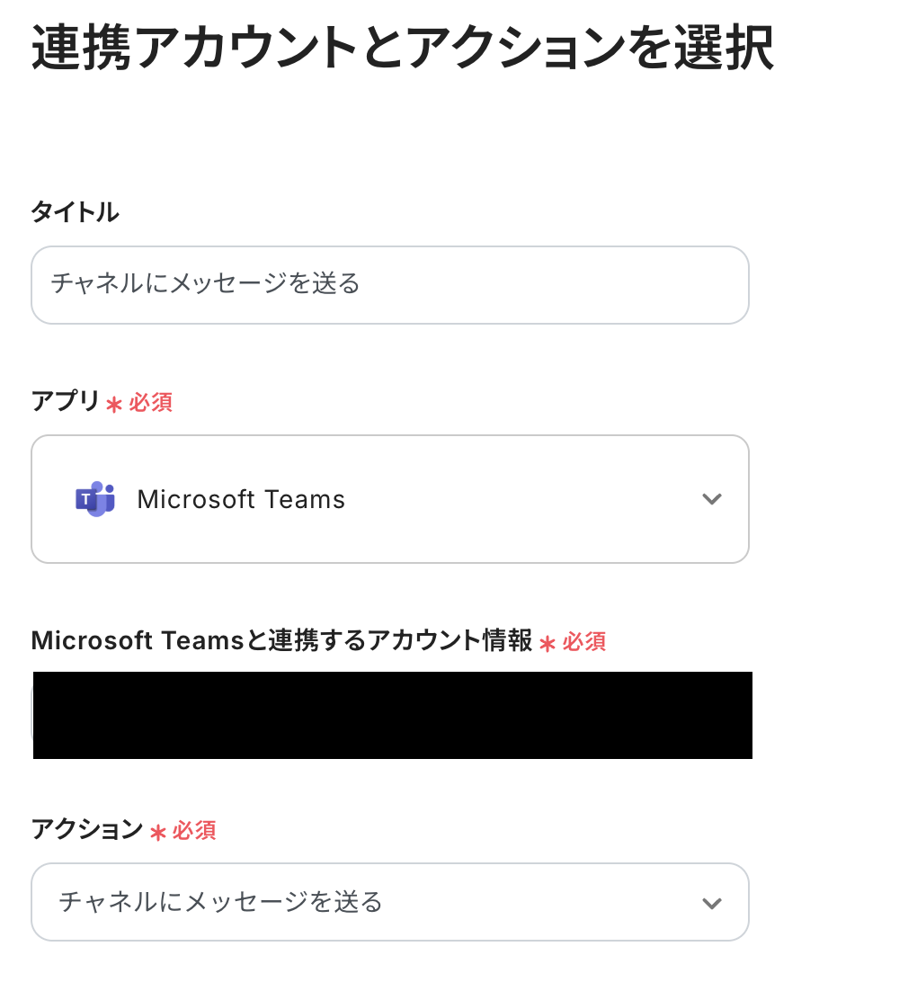 タイトルは、変更OKです。 Microsoft Teamslと連携するアカウント情報を確認しましょう。 アクションは「チャネルにメッセージを送る」が選択されていることを確認し、次へをクリックします。