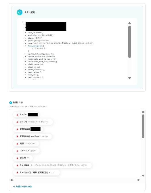 実際にホットプロファイルでタスクを作成し、Yoomで「テスト」をクリックしましょう。