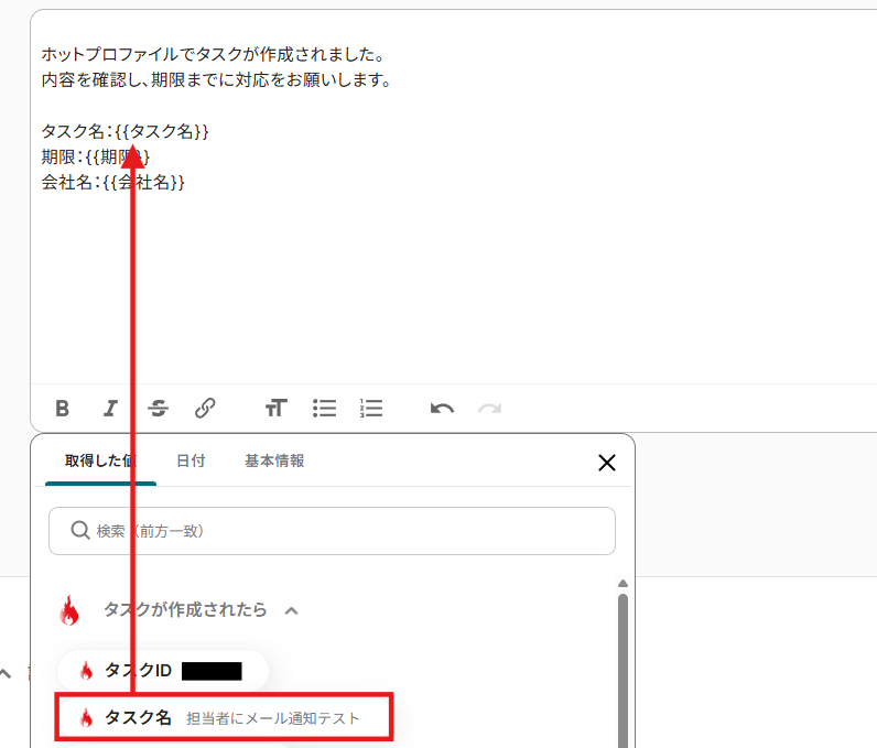 本文には以下のようにホットプロファイルから取得した値を用いてタスク名等入力しました。