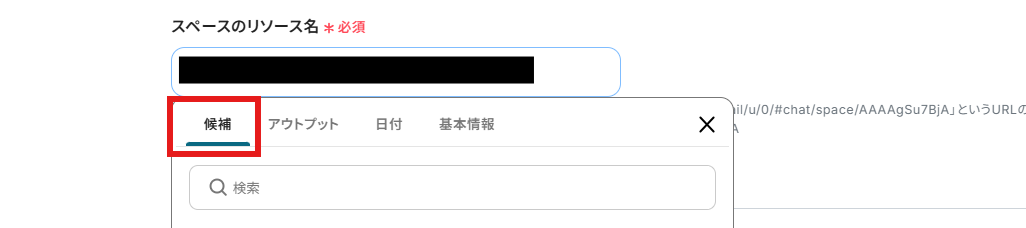 スペースのリソース名:入力欄をクリックすると、以下のように候補が表示されます。