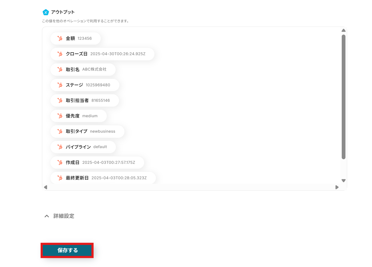テストが成功すると、以下のようにHubSpotから取得した情報がアウトプットとして表示されます。