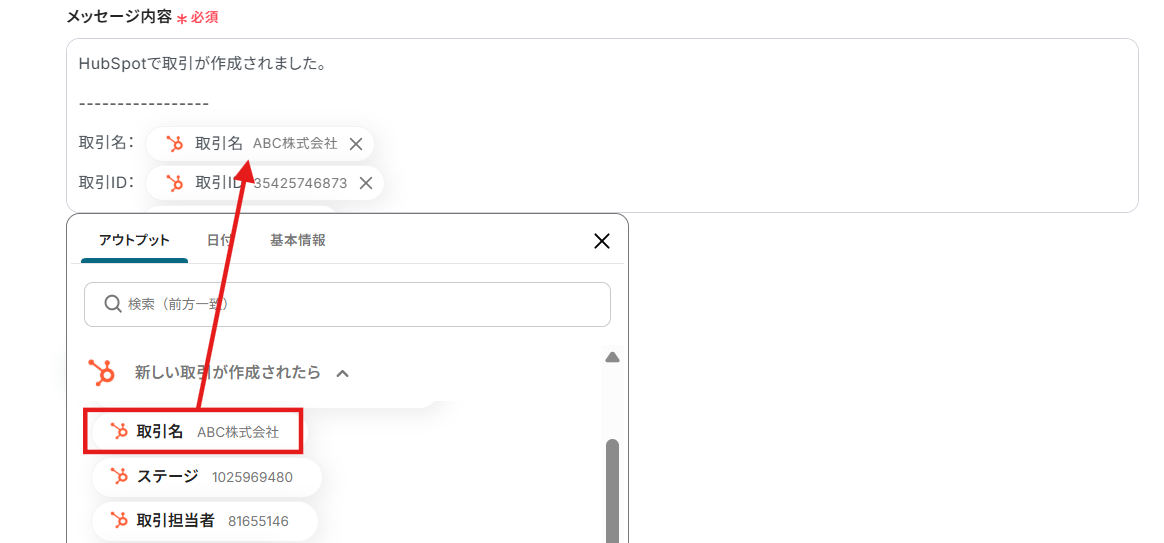 Google Chatのアクション設定時に項目を入力できる箇所があります。入力項目は入力欄をクリックすると候補一覧が表示されるので、その中から選ぶことができます。最後に、入力したい値をステップ3で取得したHubSpotのデータを埋め込み、設定は完了です。