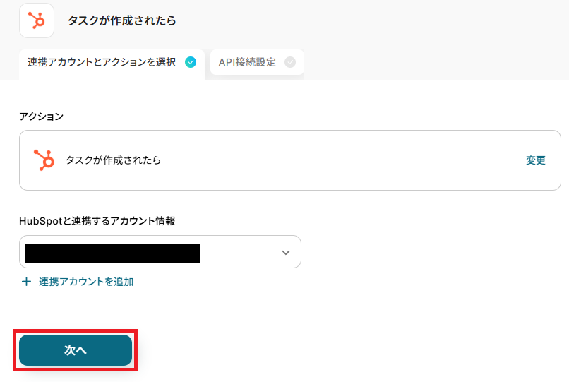 HubSpotと連携するアカウントに間違いがないかを確認し、「次へ」をクリックしましょう。