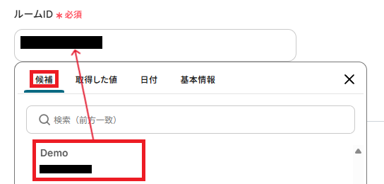 「ルームID」は、タスクの発生を通知するルーム先を指定します。