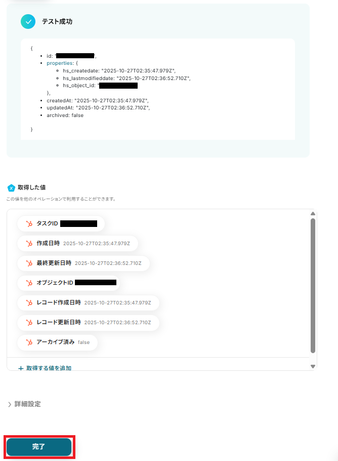 設定完了後、「テスト」を実行しましょう。