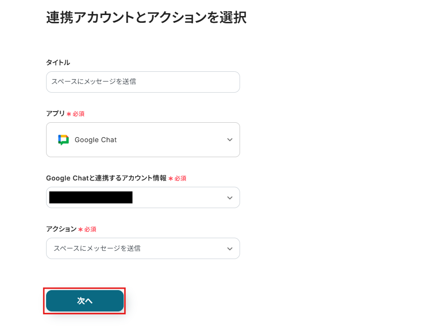メッセージ内容は設定例を参考に入力してください。 Google Chatに転送する本文になります。