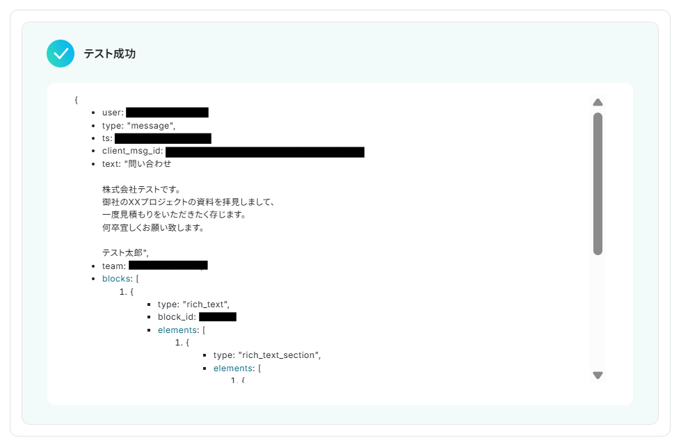 指定したチャンネルに実際にメッセージを投稿してから、テストしてください。
