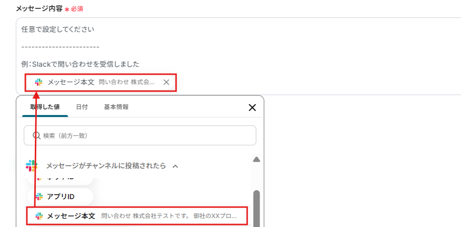 メッセージ本文は、取得した値から選択しましょう。
