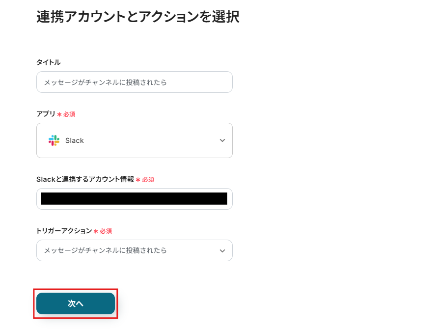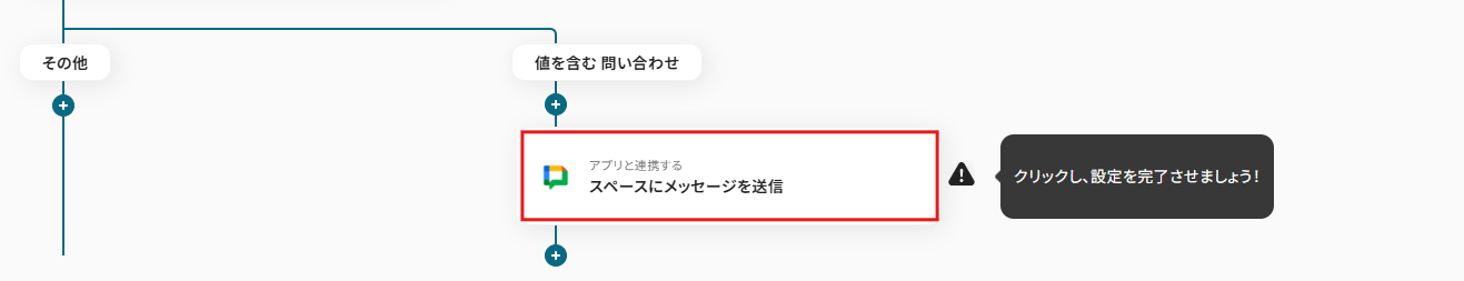 今回は、Slackに問い合わせが投稿されたらGoogle Chatに通知するフローなので、「問い合わせ」に設定してください。