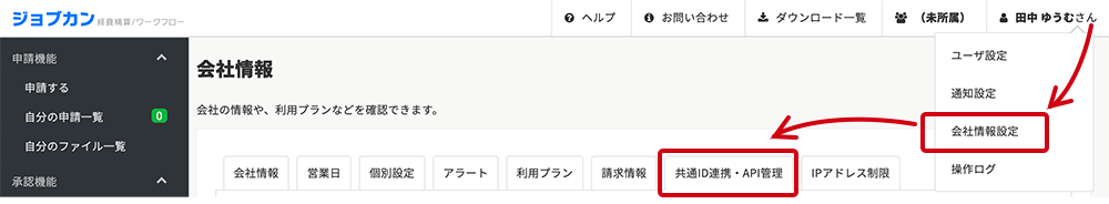 - 右上アカウント名<会社情報設定 会社情報の画面に切り替わります。画面内のタブ「共通のID連携・API管理」をクリックします。
