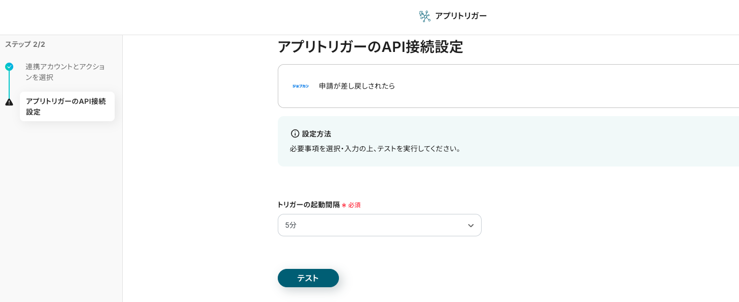 起動間隔の選択が終わったら動作テストに進みますが、その前に連携したジョブカン経費精算・ワークフローで「テスト用の申請の差し戻し」を行ってください。イベント(テスト用の申請の差し戻し)が発生していないと、テストで検知ができません。