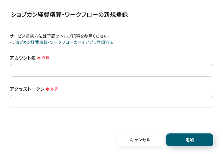検索結果から「ジョブカン経費精算・ワークフロー」をクリックすると、連携に必要な値を入力する画面が表示されます。