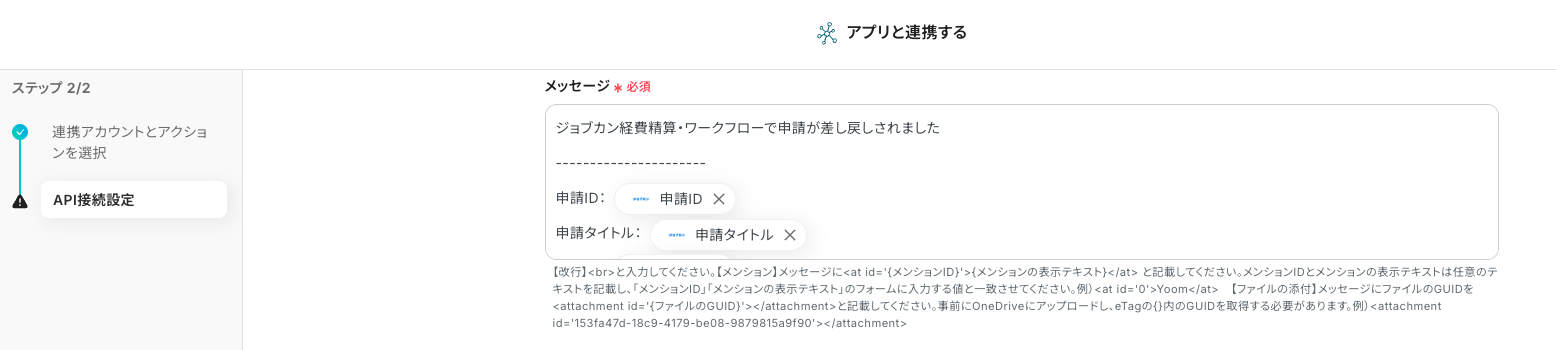 - メンションを設定する場合は、メッセージ編集エリアの下の、メンション値を紐付けするボックスに値を入力します。添付ファイル情報も同じく値を挿入します。