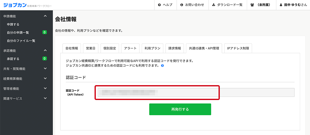 - ジョブカン経費精算・ワークフローの管理画面から、APIトークンを取得して入力します。