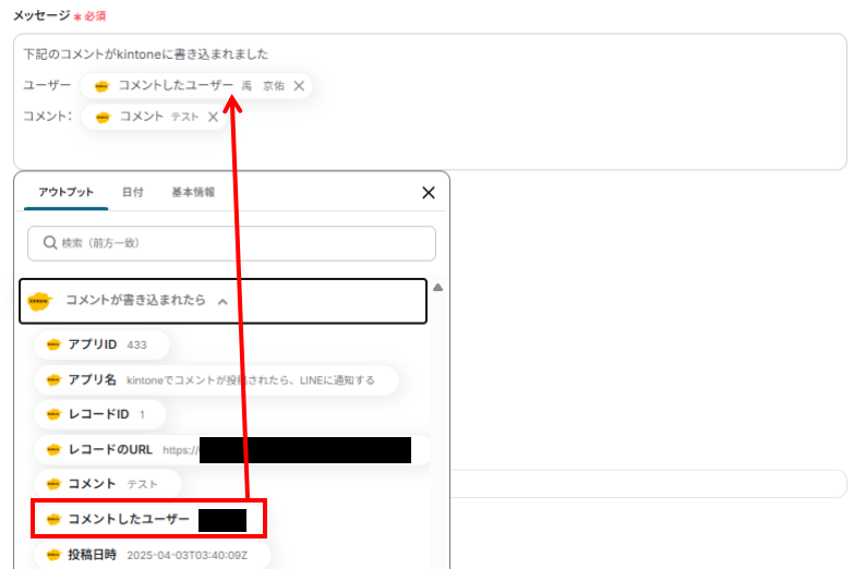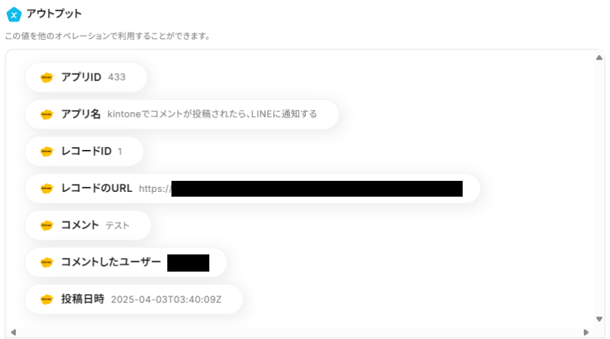 今回ご紹介した「コメントが書き込まれたら」というkintoneのトリガーでは、「レコードのURL」も取得できるので、通知メッセージに引用できますよ!