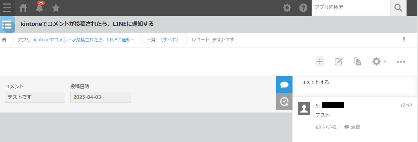 先ほど作成したkintoneアプリとコメントの内容が反映されていればOKです!