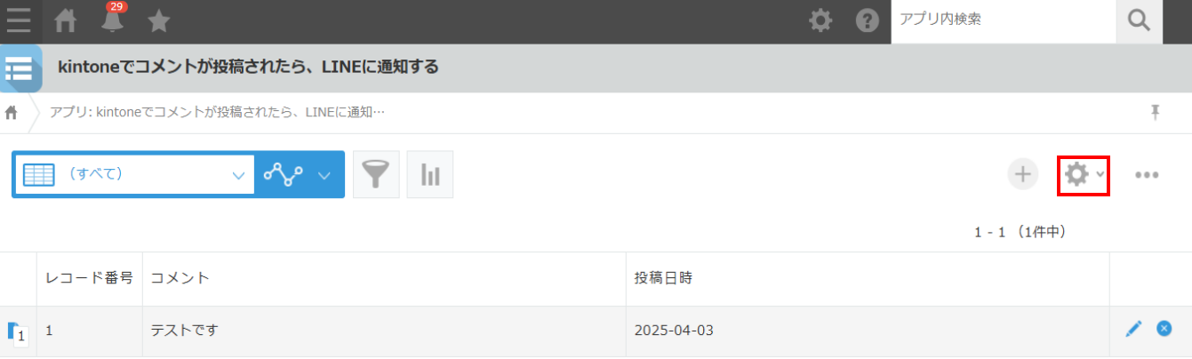 先ほど作成したkintoneアプリに移動し、右上の歯車マークをクリックします。