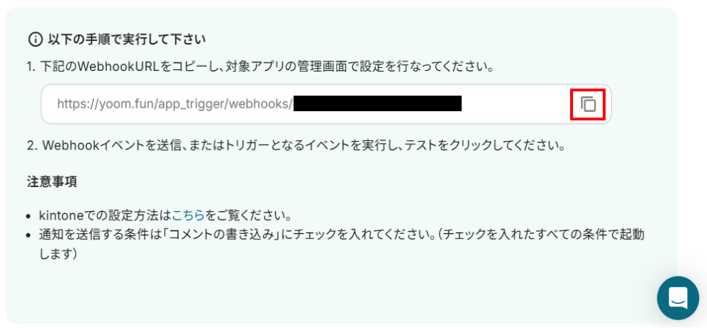 まず、下記画像の赤枠をクリックしWebhookURLをコピーしてください。