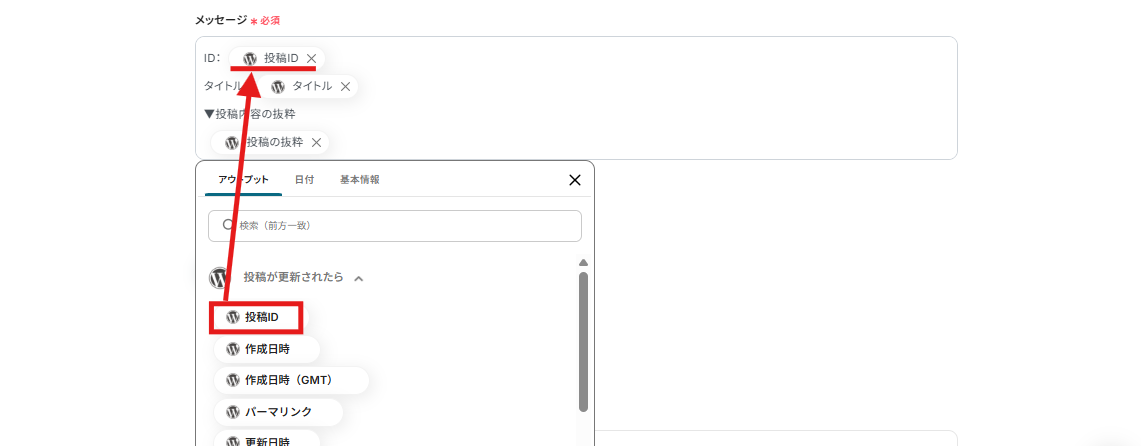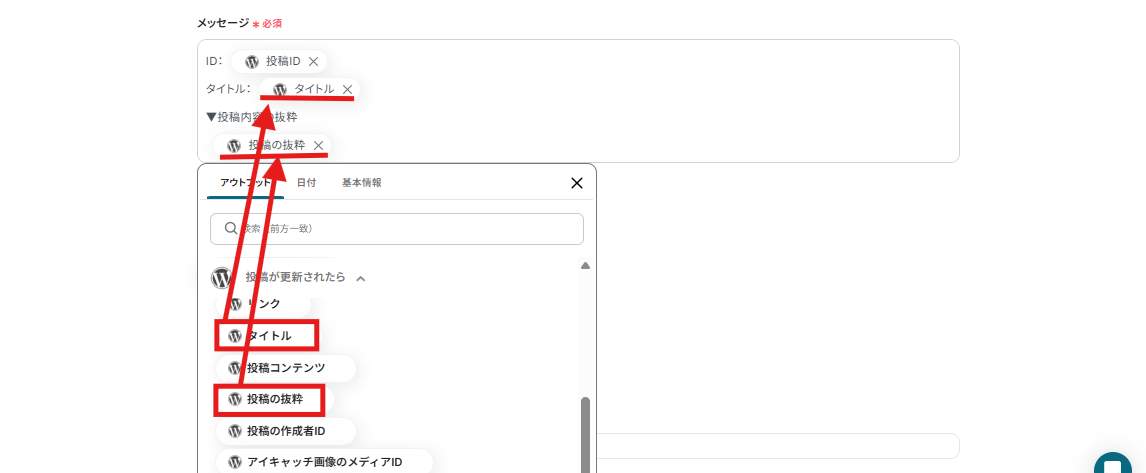 例えば下図のように設定すると、WordPressで投稿が更新されたら「投稿ID」「タイトル」「投稿の抜粋」を自動取得し、先ほど設定したLINE公式アカウントのユーザーIDに自動通知することができます!