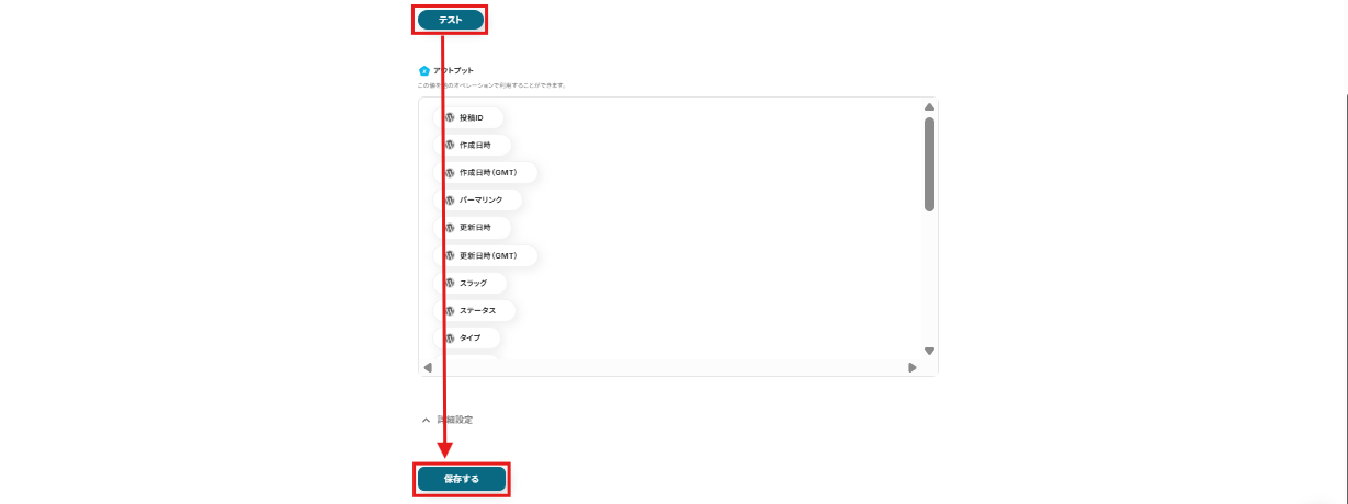 テストが成功したら、アウトプットが取得されるので確認しましょう!「保存する」ボタンを押してアプリトリガーの設定完了です。