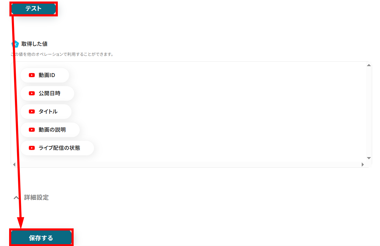 テスト成功後、アウトプットが取得されるので確認し設定を保存しましょう。