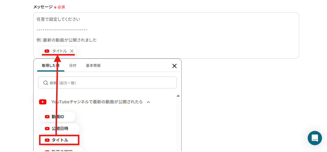 この設定により、YouTubeチャンネルに新しい動画がアップロードされたら「タイトル」を自動で取得し、LINE公式アカウントの設定したユーザーIDに自動で通知できます。