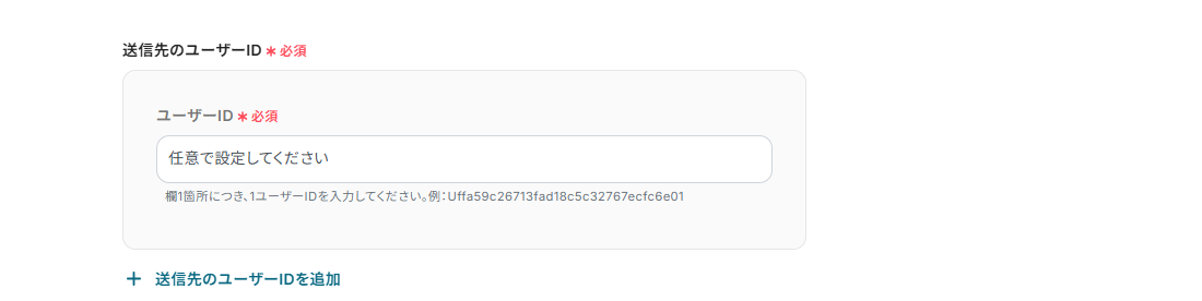 通知を受け取りたいユーザーが複数いる場合は「送信先のユーザーIDを追加」を押し入力欄を増やしユーザーIDを入力してください。