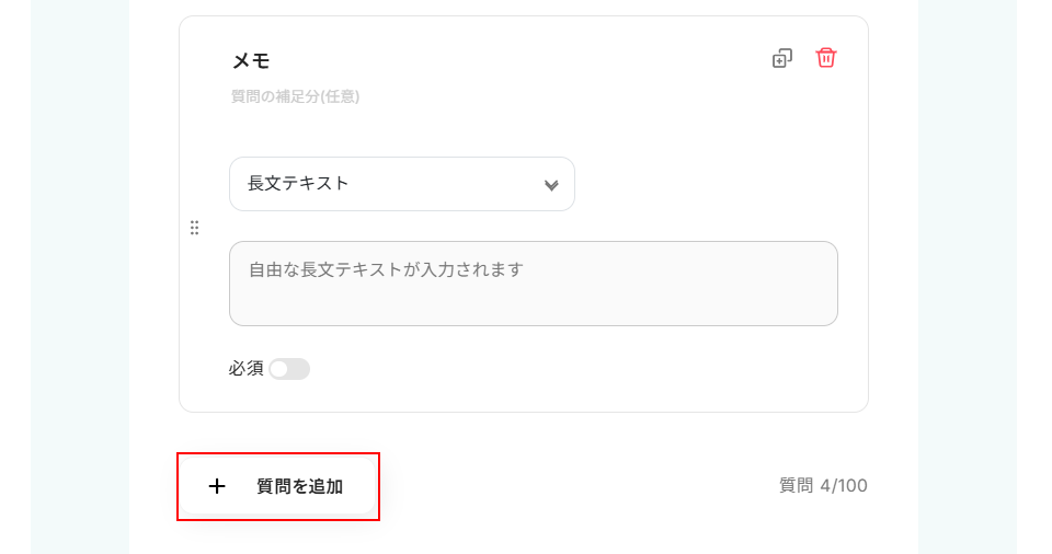 追加したい項目がある場合は+質問を追加をクリックして設定を行ってください。