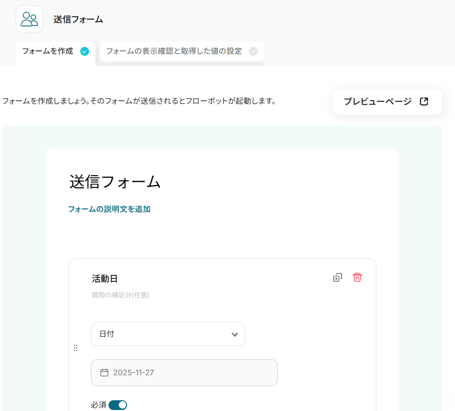 送信フォームにはデフォルトで活動日、氏名、業務内容、メモの項目が設定されています。