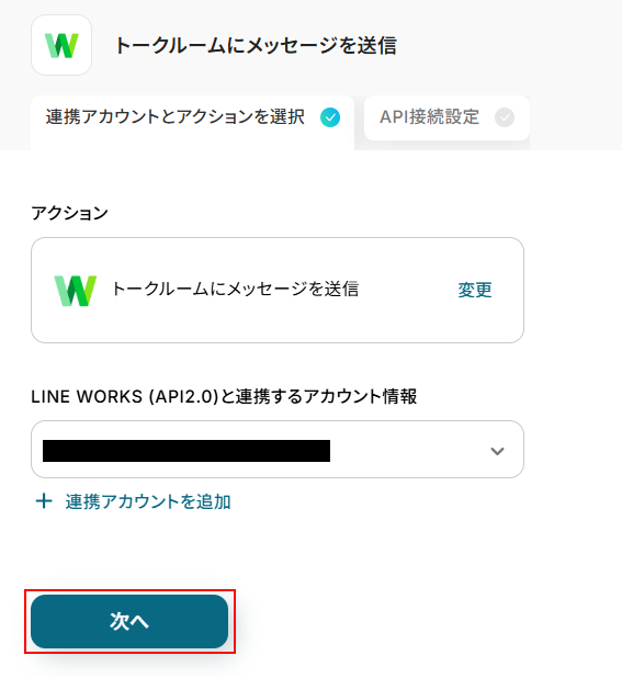 ステップ4:LINE WORKSのトークルームにメッセージを送信する設定