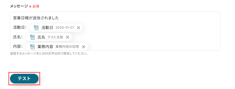 ※テストをクリックすることで、実際にメッセージが送信されます。