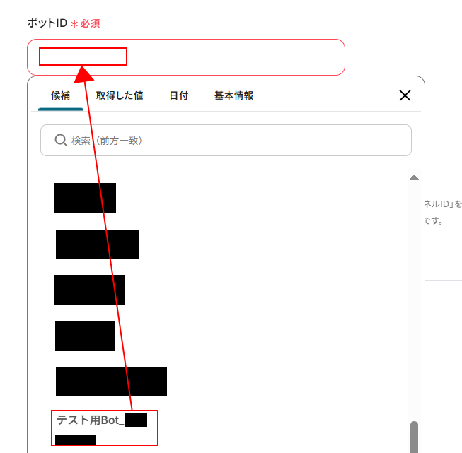 入力欄をクリックし、表示された候補の中から使用したいボットを選択してください。