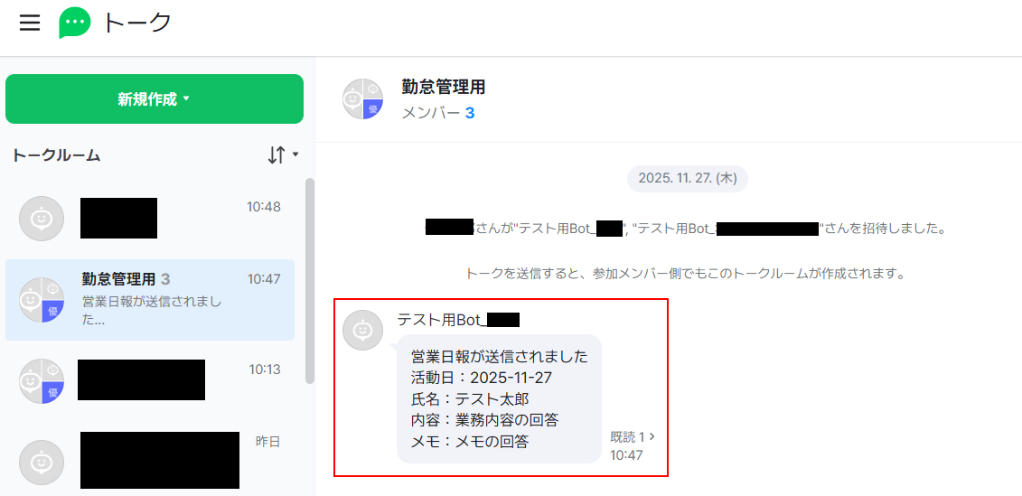 また、実際にLINE WORKSのトークルームにメッセージが送信されていますのでご確認ください。