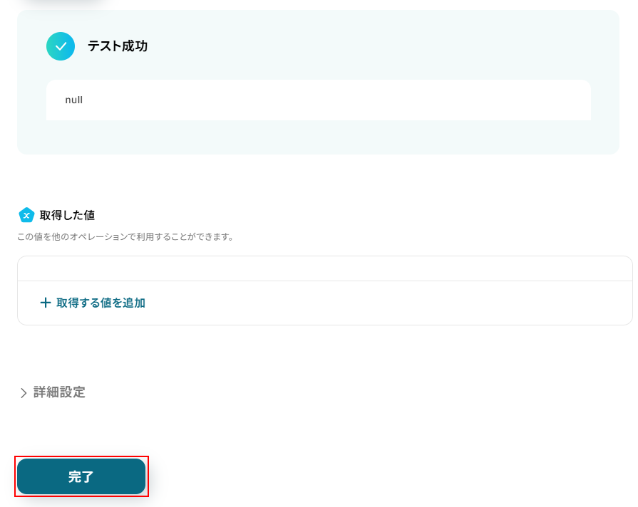 取得した値は実行した結果が設定される動的な値として利用できるため、このあとの設定でも使用します。